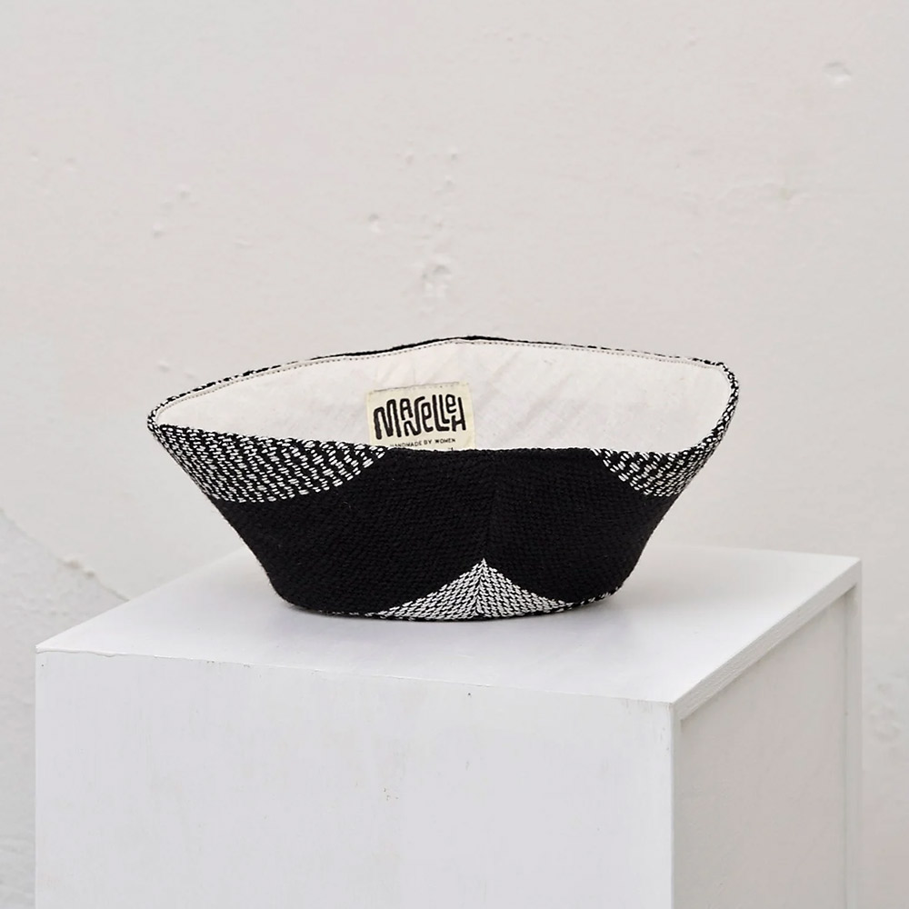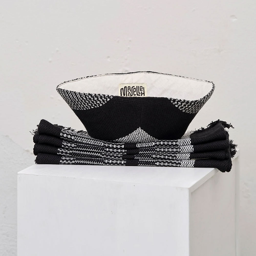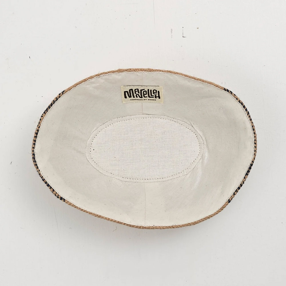 Dækkeservietten og brødkurven er lavet af en blanding af bomuld og jute, som er en naturfiber. Stoffet er håndvævet med afsæt i globale fair trade principper og hvert produkt har taget cirka to timer at lave. Brødkurven er indvendigt beklædt med råhvid bomuld og polstret med et tyndt lag genanvendt gummi, som gør kurven fast.