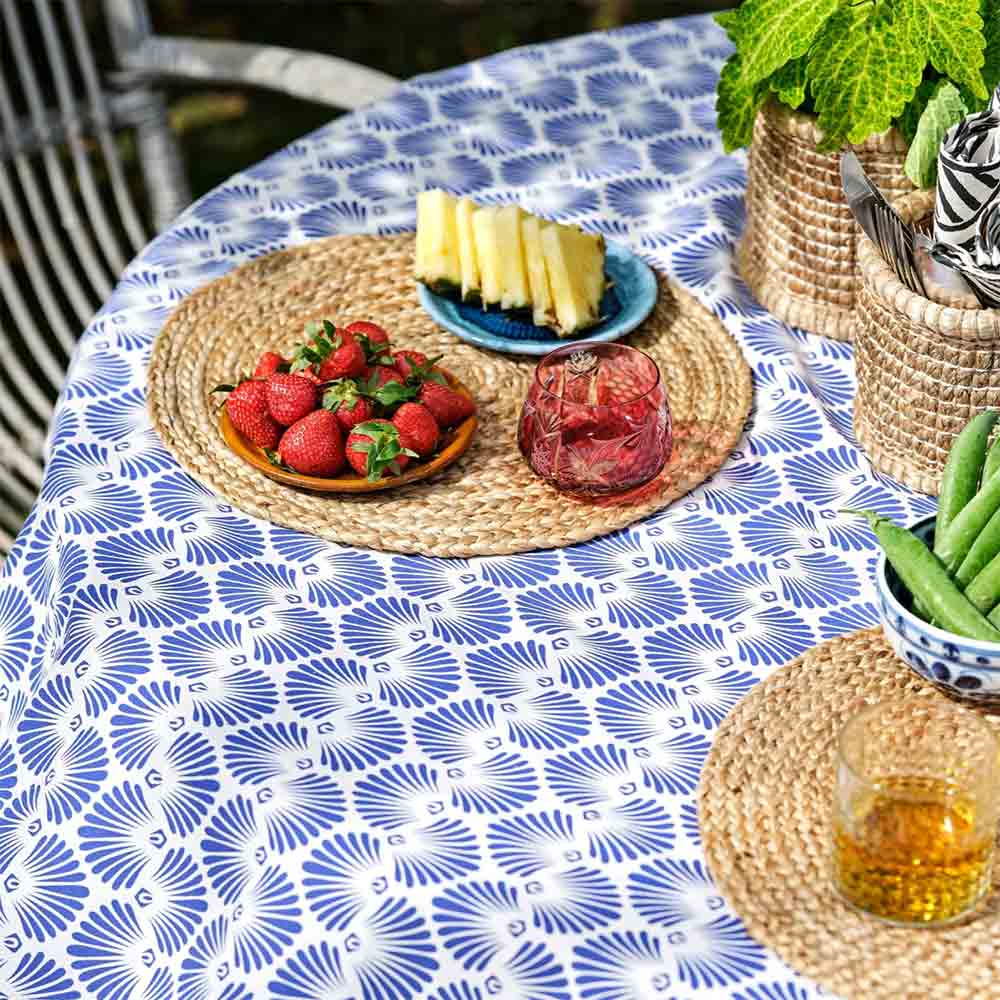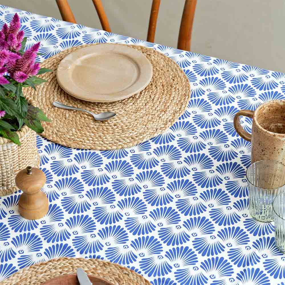 Vi håber, at du vil blive draget af de fine farver og mønstre på denne smukke dug. Denne dug er håndprintet med et smukt blåt mønster og kan bruges til at dekorere bordet ved enhver lejlighed.