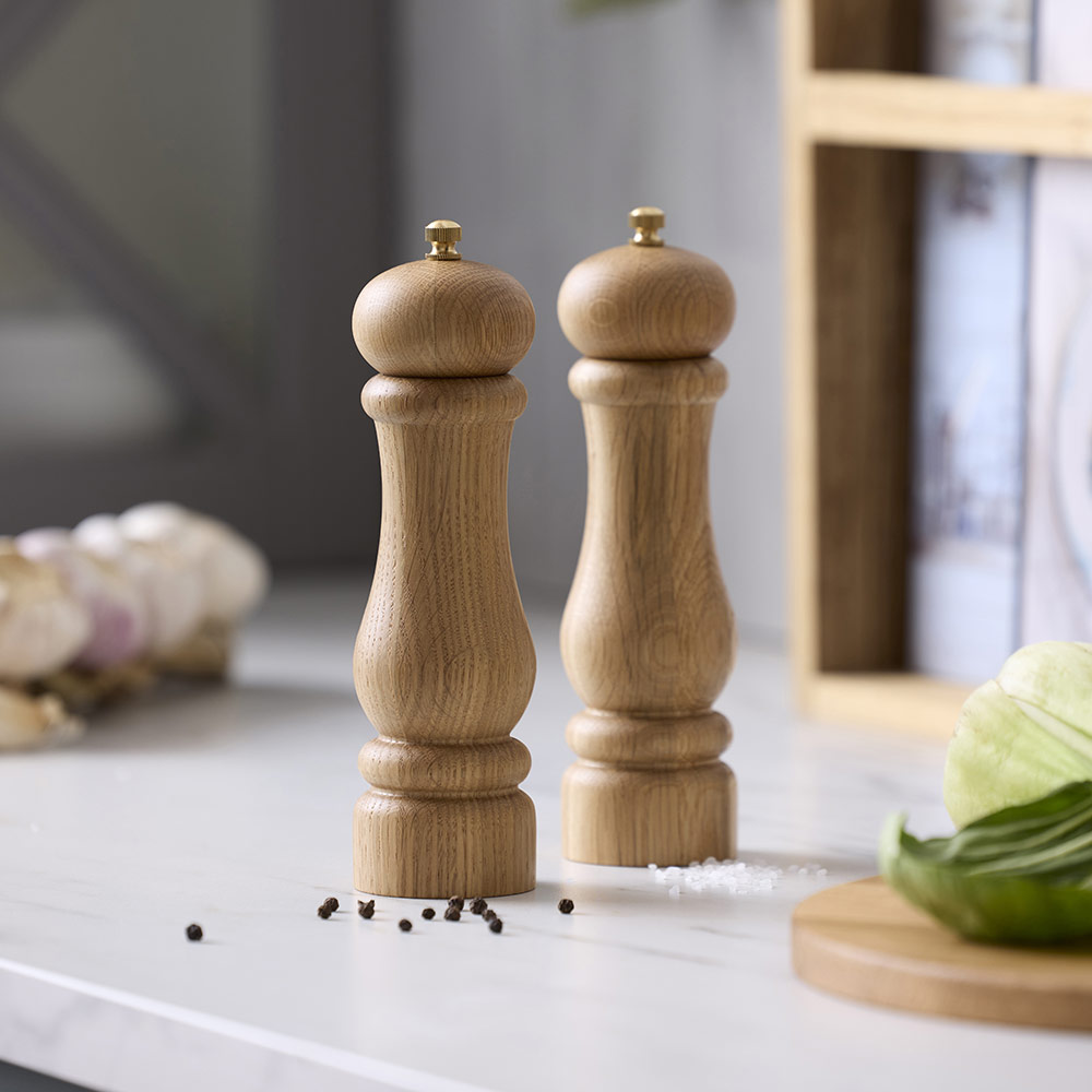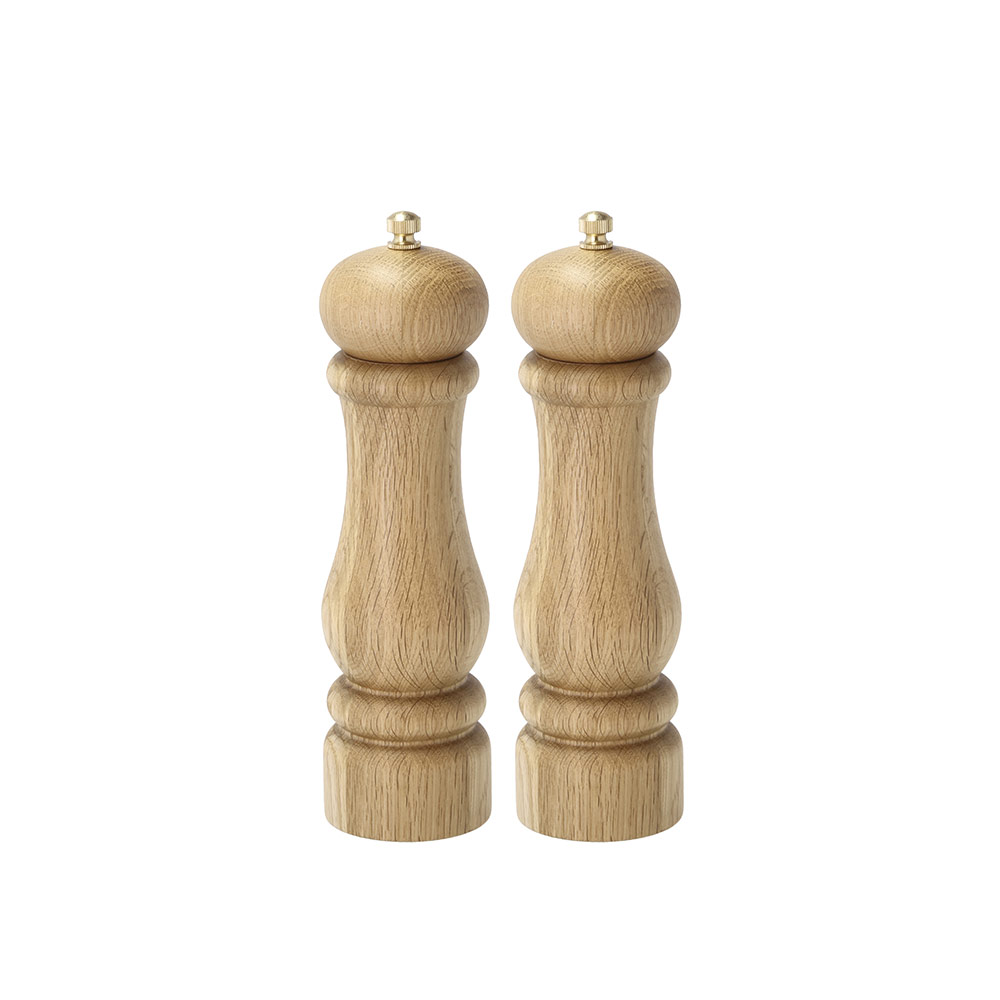 Salt og peber præsenteres på allersmukkeste vis i de elegante Douron-kværne i FSC-certificeret egetræ. Kværnene fås i flere flotte størrelser, der alle er perfekte til at give maden ekstra krydderi.