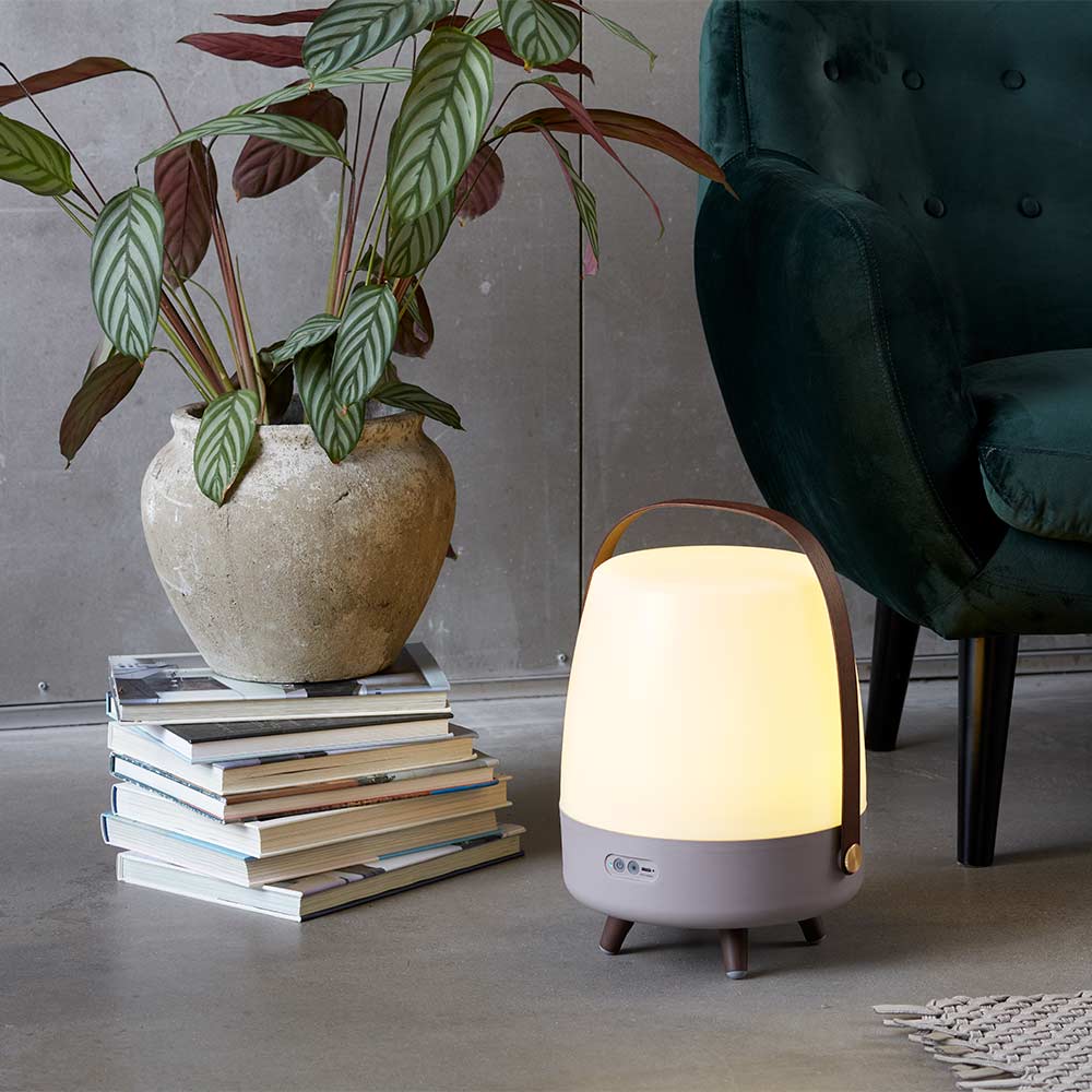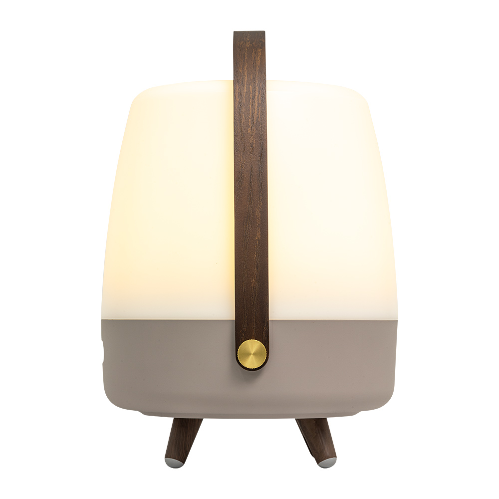 Denne lampe/højtaler er udført i hvid plast, og bunden er lavet i træ og silikone, så den er skridfast – i toppen er der monteret en hank i træ, så du kan tage den med rundt. Lampens lys er i den klar varm hvide farve 3000 kelvin.