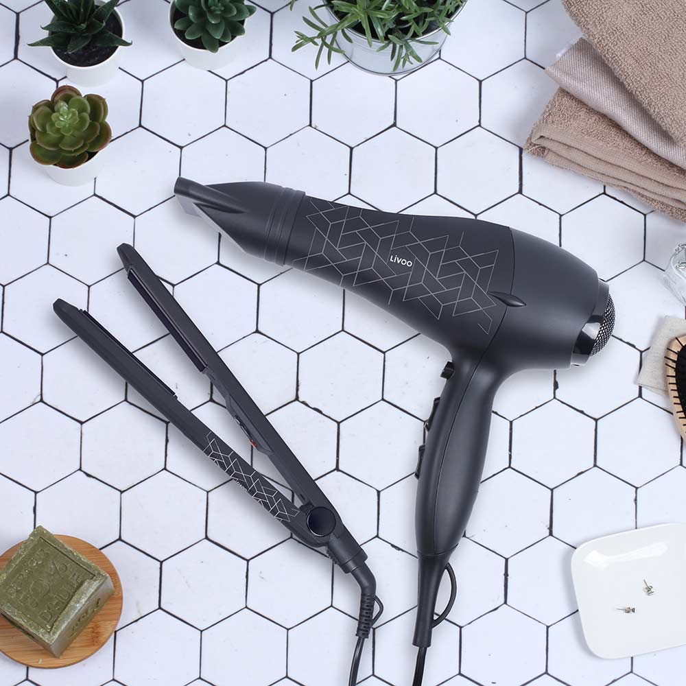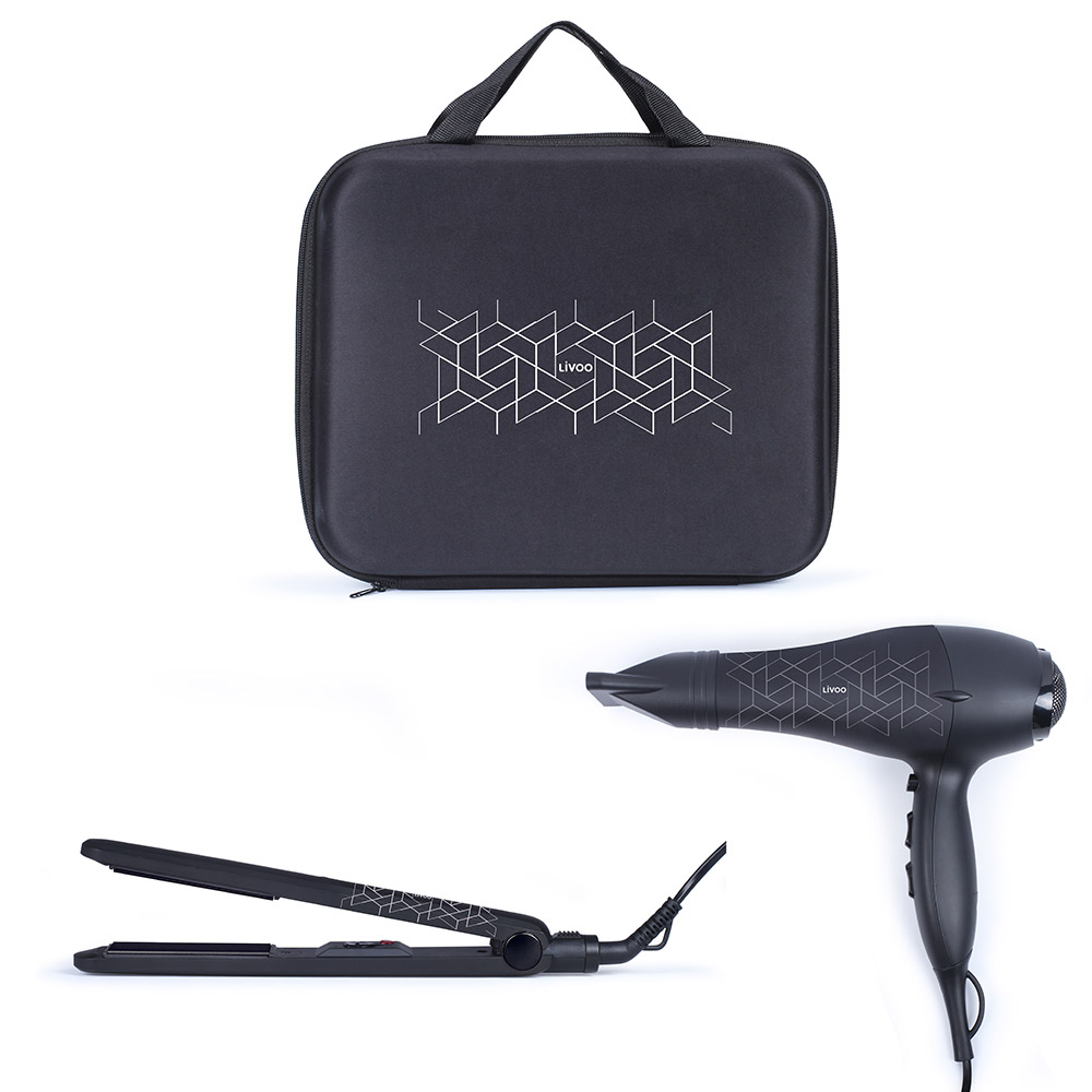 Det flotte gavesæt fra Livoo indeholder både en hårtørrer samt et glattejern, som bliver leveret i en eleganttaske. Hårtørreren har 2 hastigheder samt 3 temperaturindstillinger inkl. en cool knap. Glattejernet har keramiske plader, som måler 90x25mm og kan indstilles i temperaturen op til 230 grader. Ledningen på glattejernet roterer frit for nemmere brug. Der medfølger en nylon taske